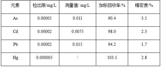 在碰撞反应模式下,以内标法校正仪器信号漂移,将配制好的各元素标准溶液上机测试,绘制标准曲线,各元素标准工作曲线线性相关系数R>0.999;对样品空白溶液平行测定11次,计算11次样品空白值的标准偏差,并以三倍标准偏差/工作曲线斜率表示检出限;间隔2min,对样品平行测定7次,计算7次测试结果对应的相对标准偏差,表示精密度;对样品进行加标实验,并计算加标回收率。各元素检出限为0.000005~0.00005mg/L,加标回收率为90.4%~103.1%,精密度为1.7%~3.5%。
